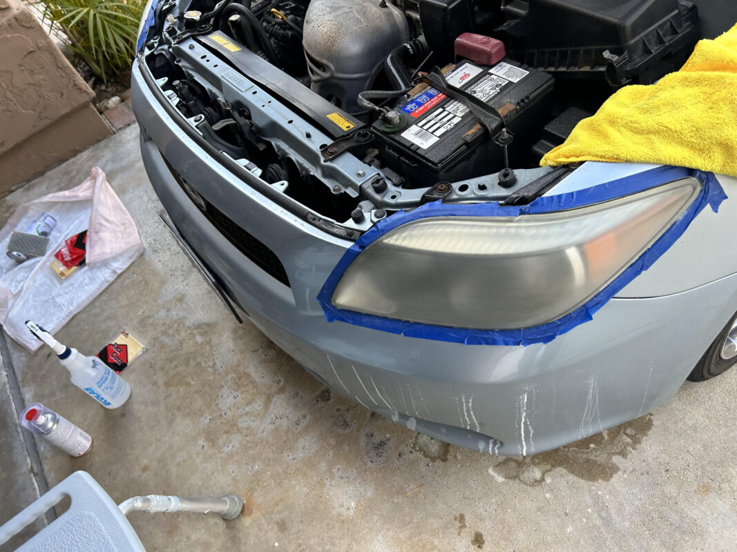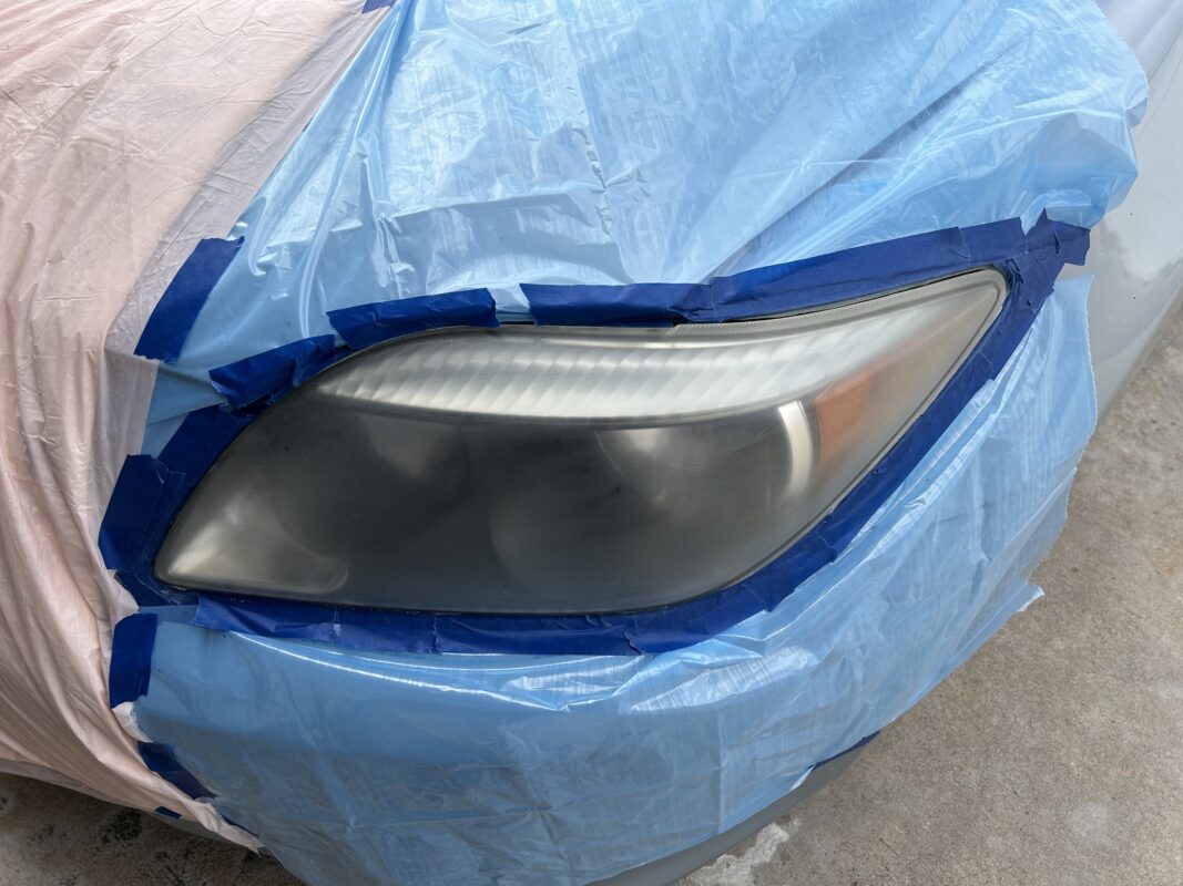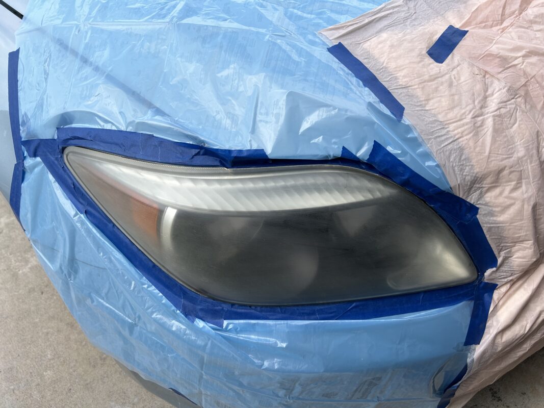 Use masking tape around the headlight edges to protect the paint, bumper, and trim. Be generous here. Two or three layers of tape is a smart idea, especially around sharp corners and tight body lines. Wet sanding can quickly chew through paint if you slip, and overspray from the clear coat is something you definitely do not want landing on your fender.